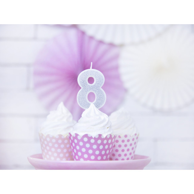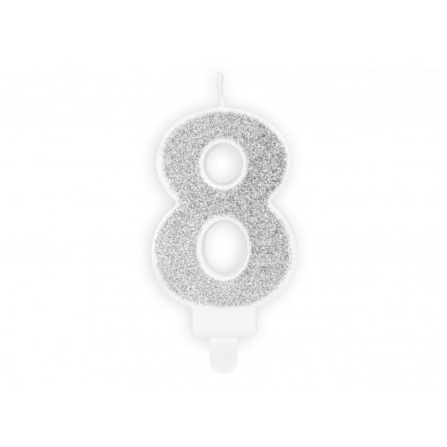 Date un tocco scintillante alla Vostra torta di compleanno con questa elegante candela argentata a forma di numero otto!